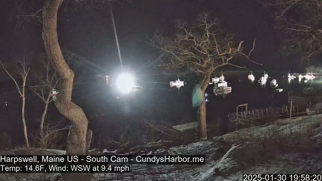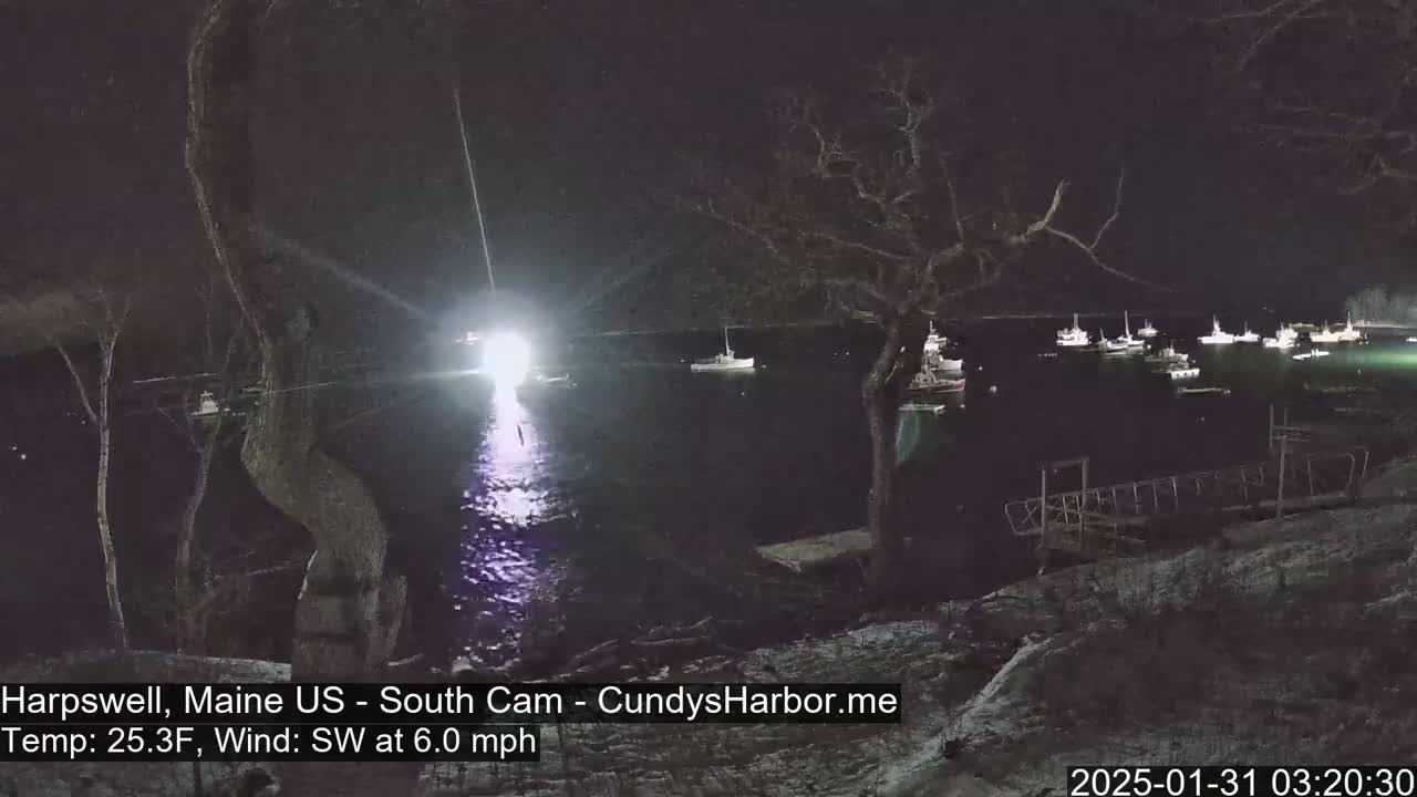 A nighttime view of a calm harbor with numerous boats illuminated, seen from behind a dark, leafless tree in a 44.4°F temperature with an 8 mph south wind.