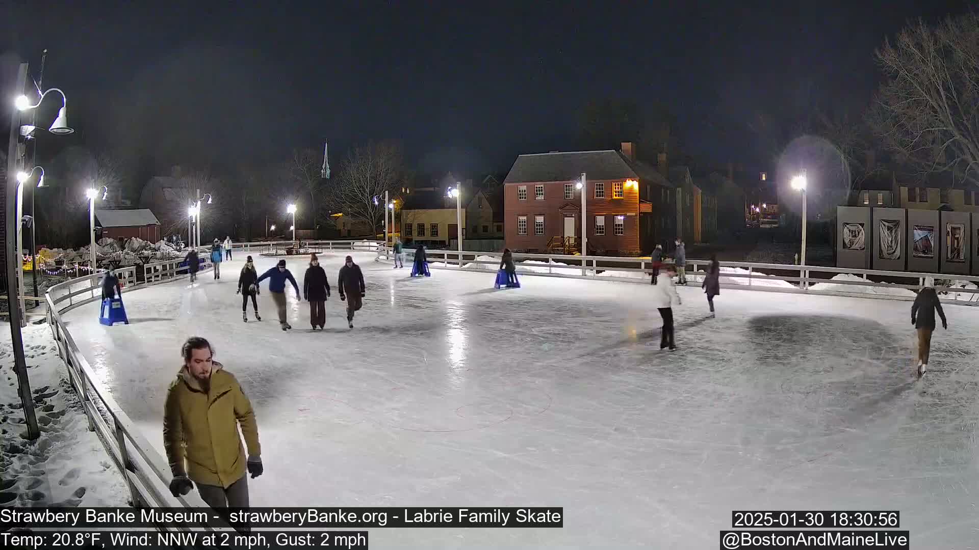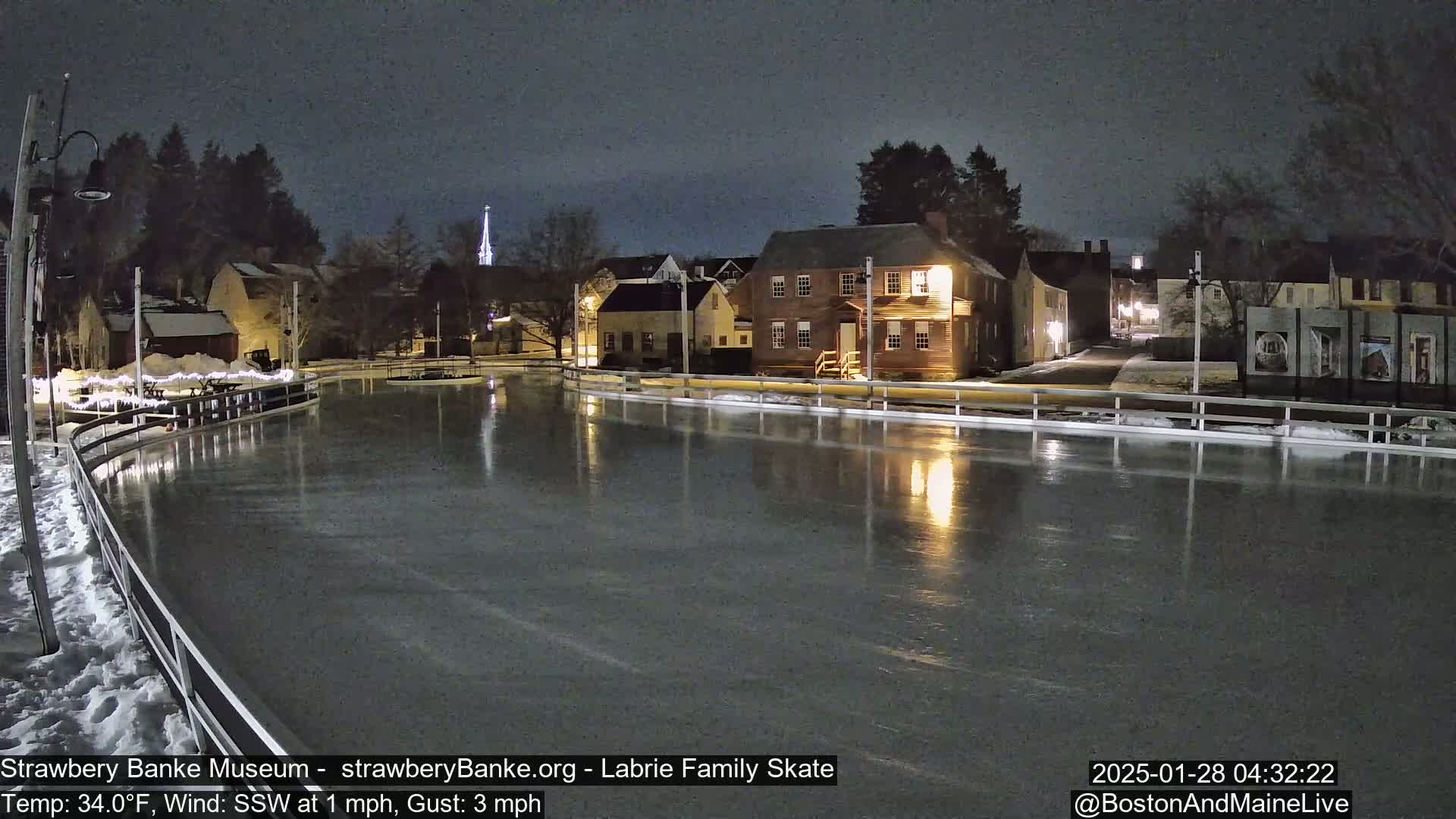 A nighttime view of a grassy area with several buildings, outdoor furniture, and umbrellas under a clear, dark sky, with a gentle northeast wind.