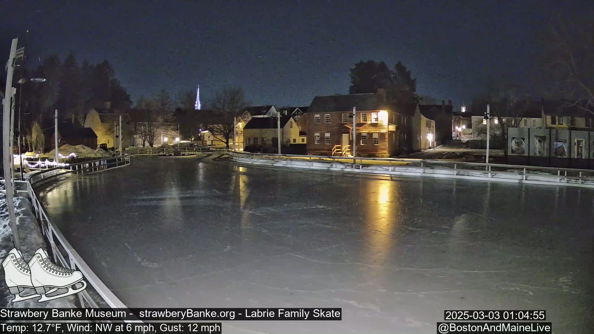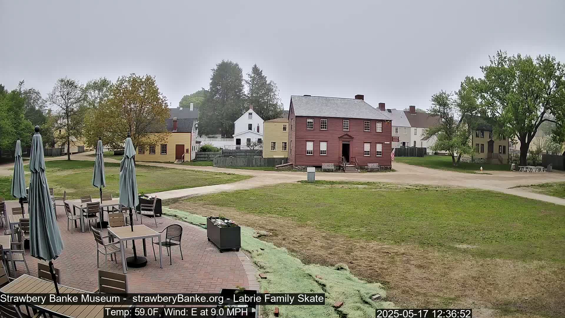 A nighttime outdoor scene shows several patio umbrellas and tables surrounding a grassy area in front of a colonial-style building, under a clear, dark sky.