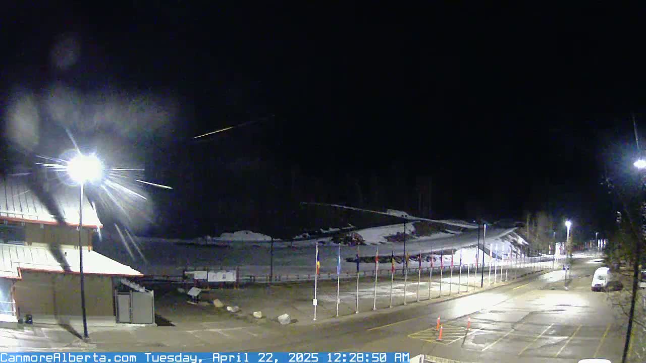 A clear, cold, and snowy night illuminates an outdoor winter scene with artificial lights highlighting snow-covered grounds, a building, and flagpoles against a backdrop of dark mountain silhouettes.