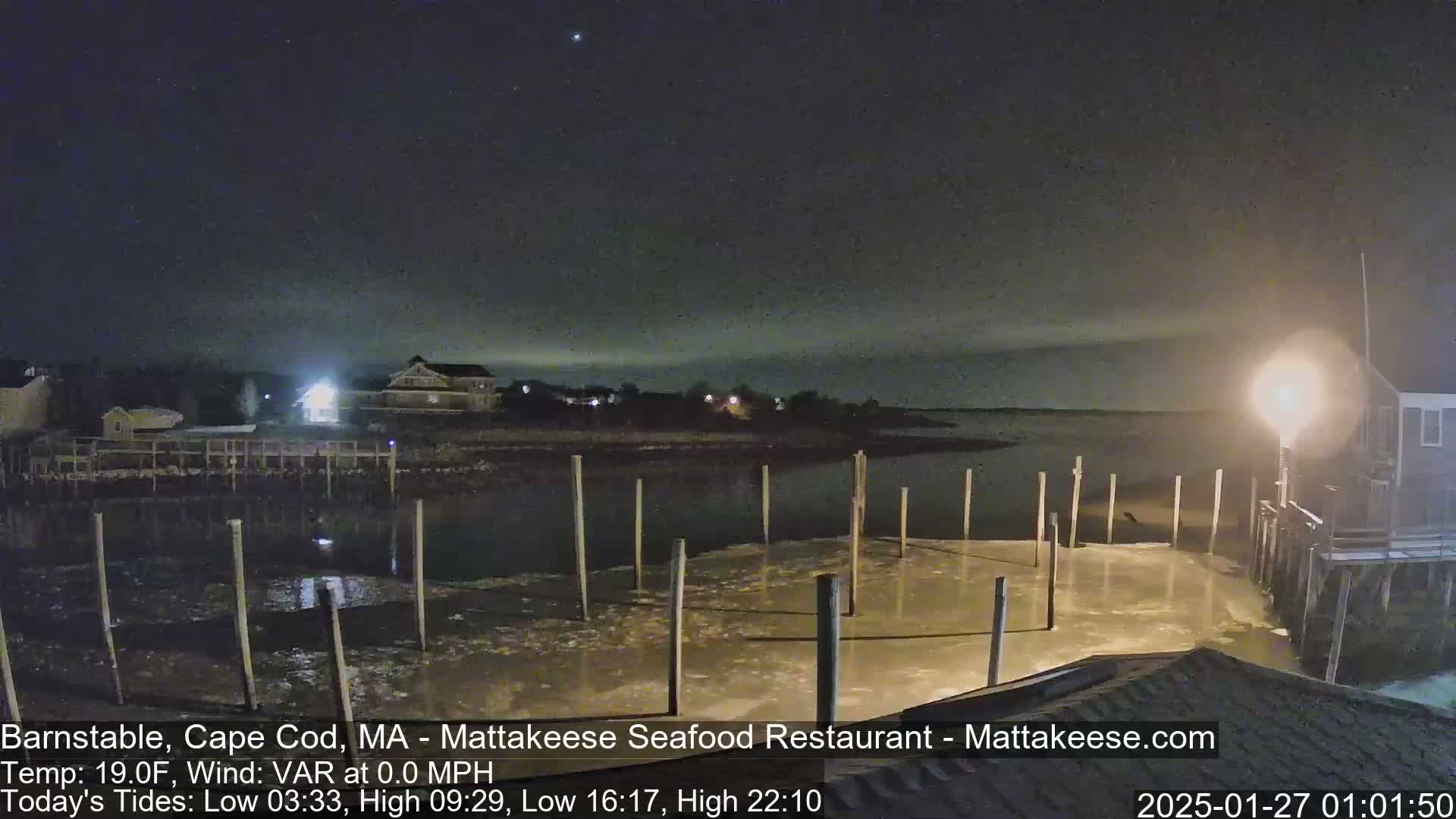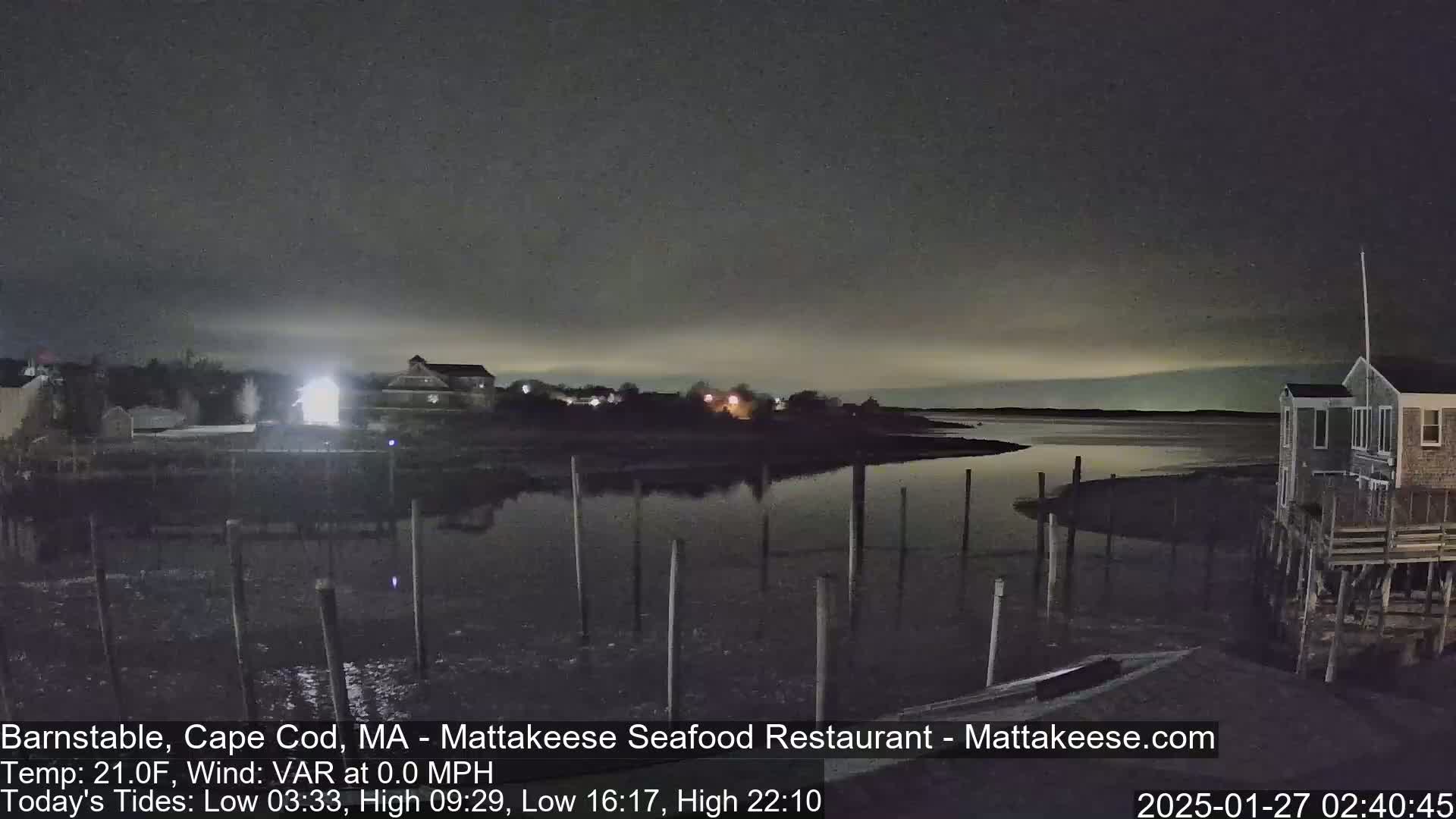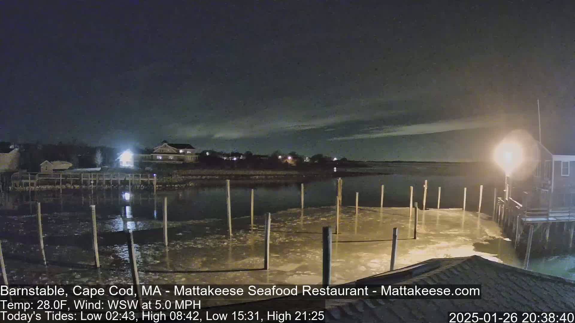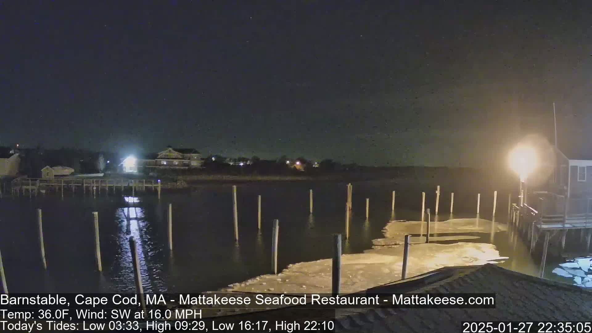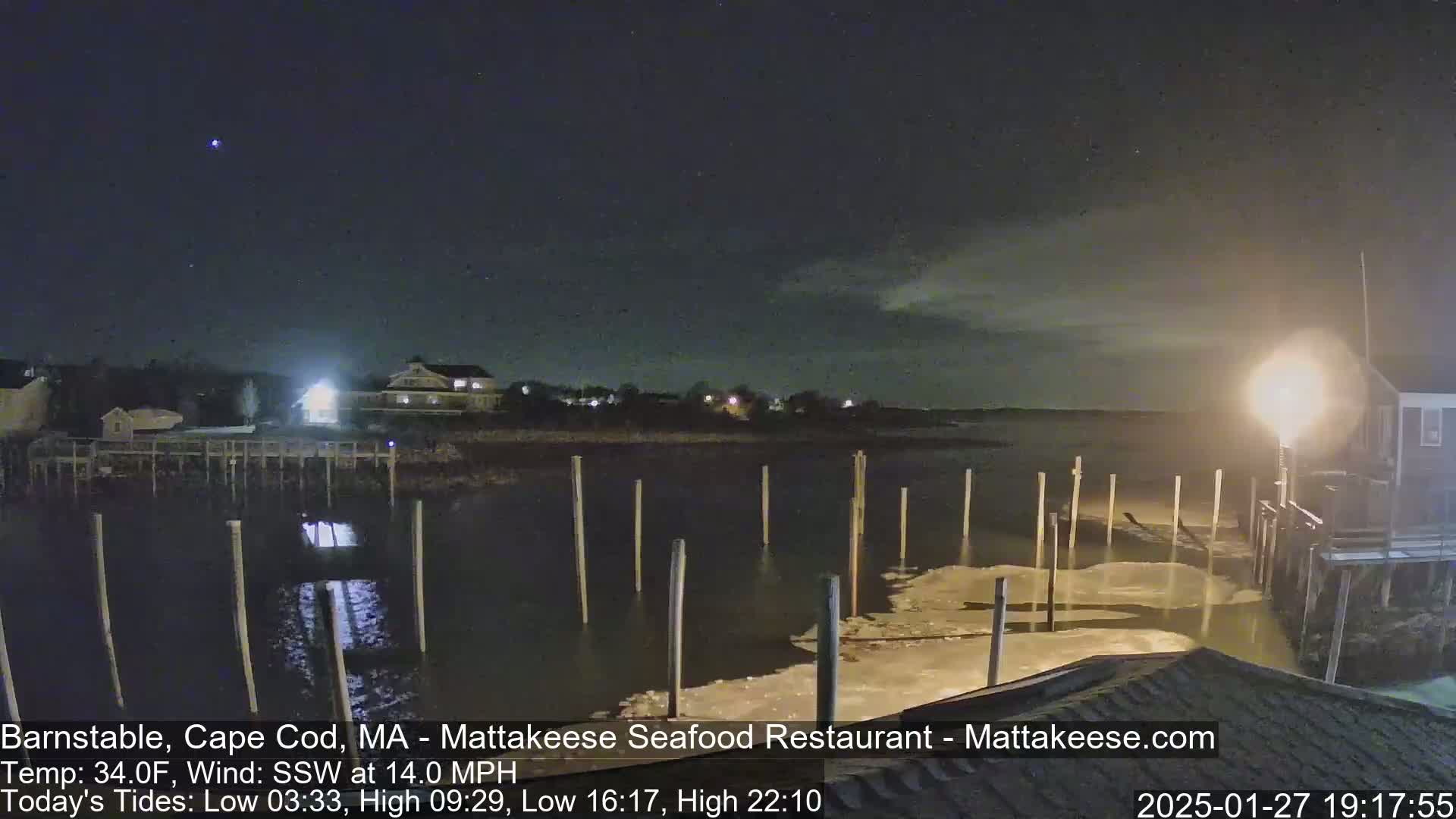 A foggy night scene shows a body of water with several posts extending from the shore, illuminated by bright lights under a dark sky with a south wind.