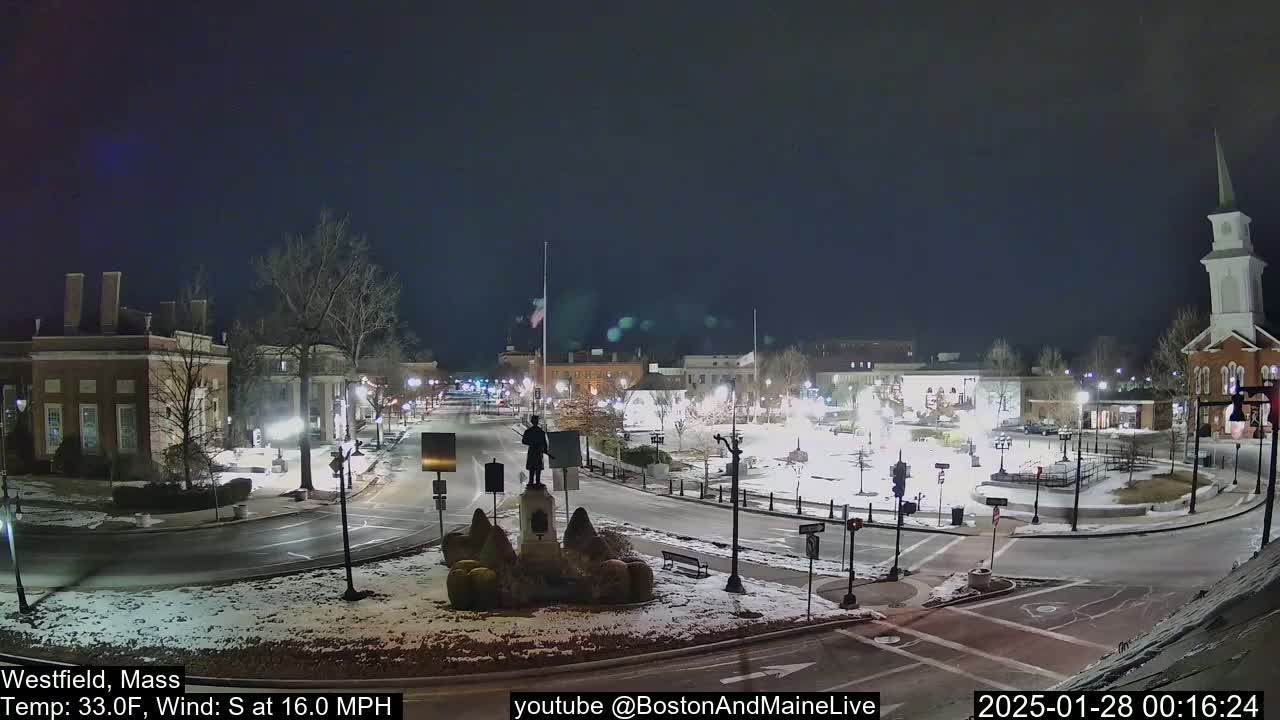 A nighttime snow flurry falls over a town square, illuminating wet streets and buildings surrounding a statue.