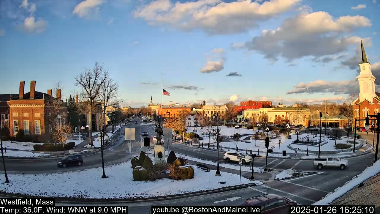 A town square with brick buildings, a statue, and a church steeple under a cloudy sky, with a moderate south wind.