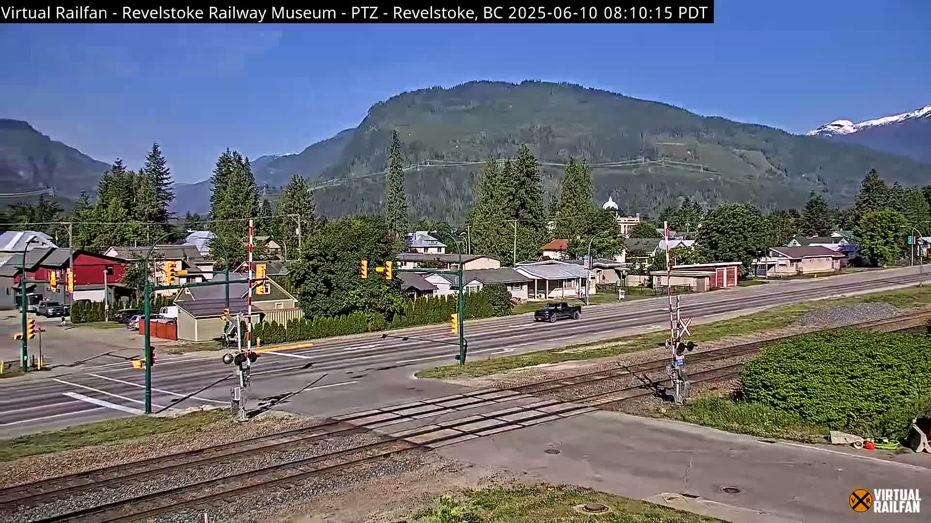 Revelstoke City & Canadian Pacific Railway Railroad Crossing Live Cam - Revelstoke, Columbia-Shuswap, British Columbia, Canada PTZ | Virtual Railfan LIVE ! 2025-03-18 12:14
